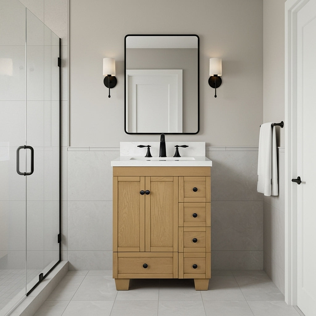 waterproof finish, soft-close doors and drawers, free back splash