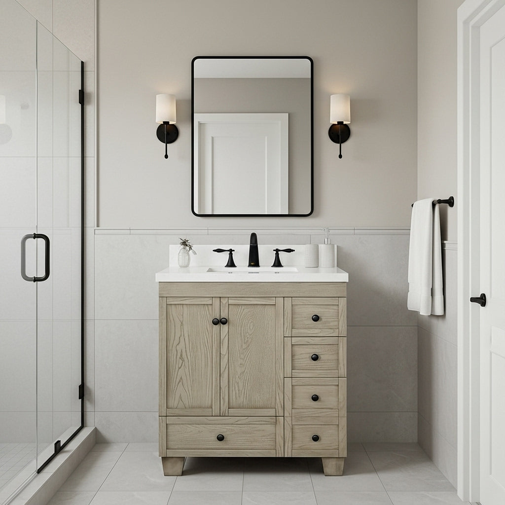 waterproof finish, soft-close doors and drawers, free back splash
