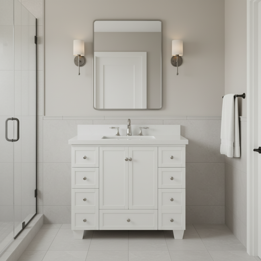 waterproof finish, soft-close doors and drawers, free back splash