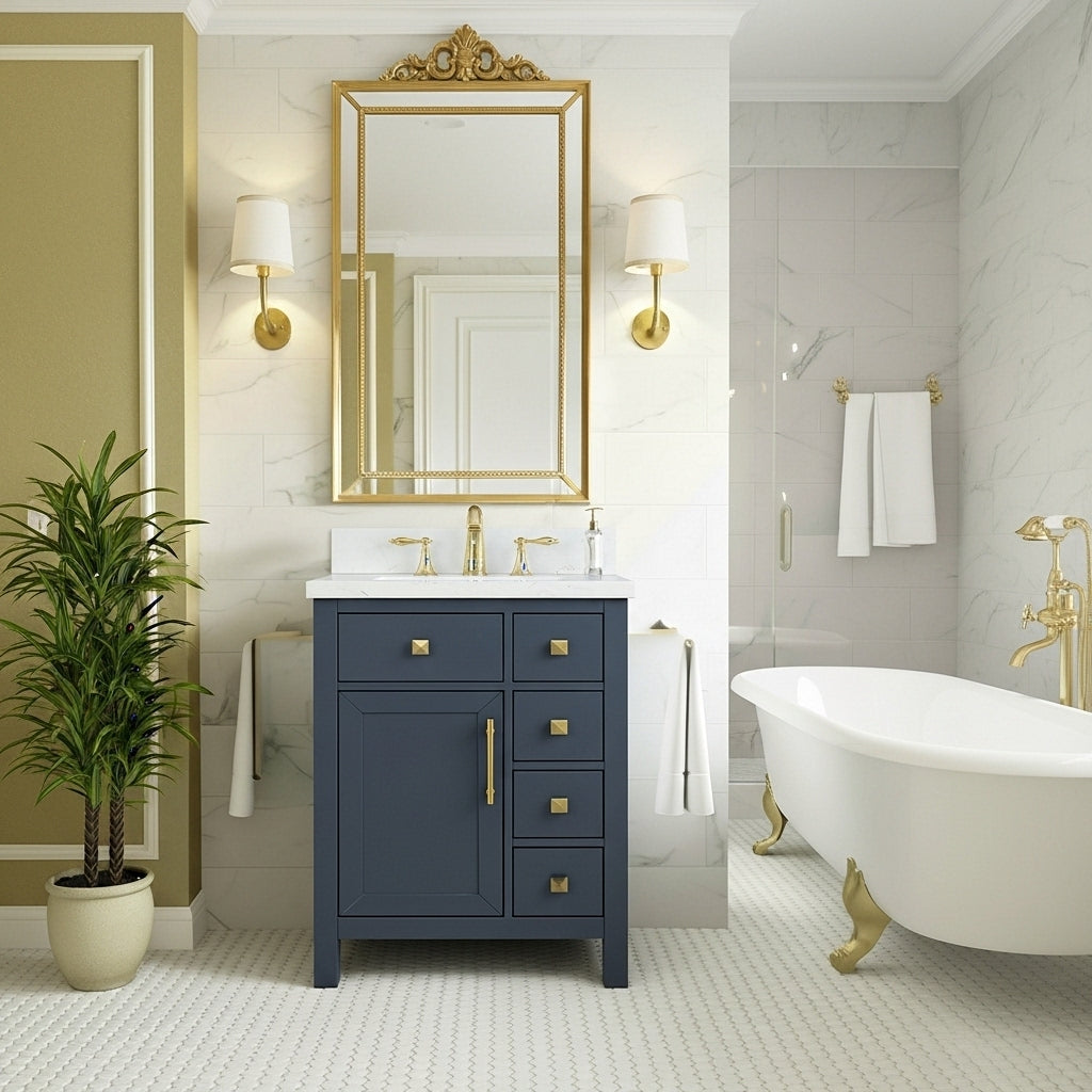 waterproof finish, soft-close doors and drawers, free back splash