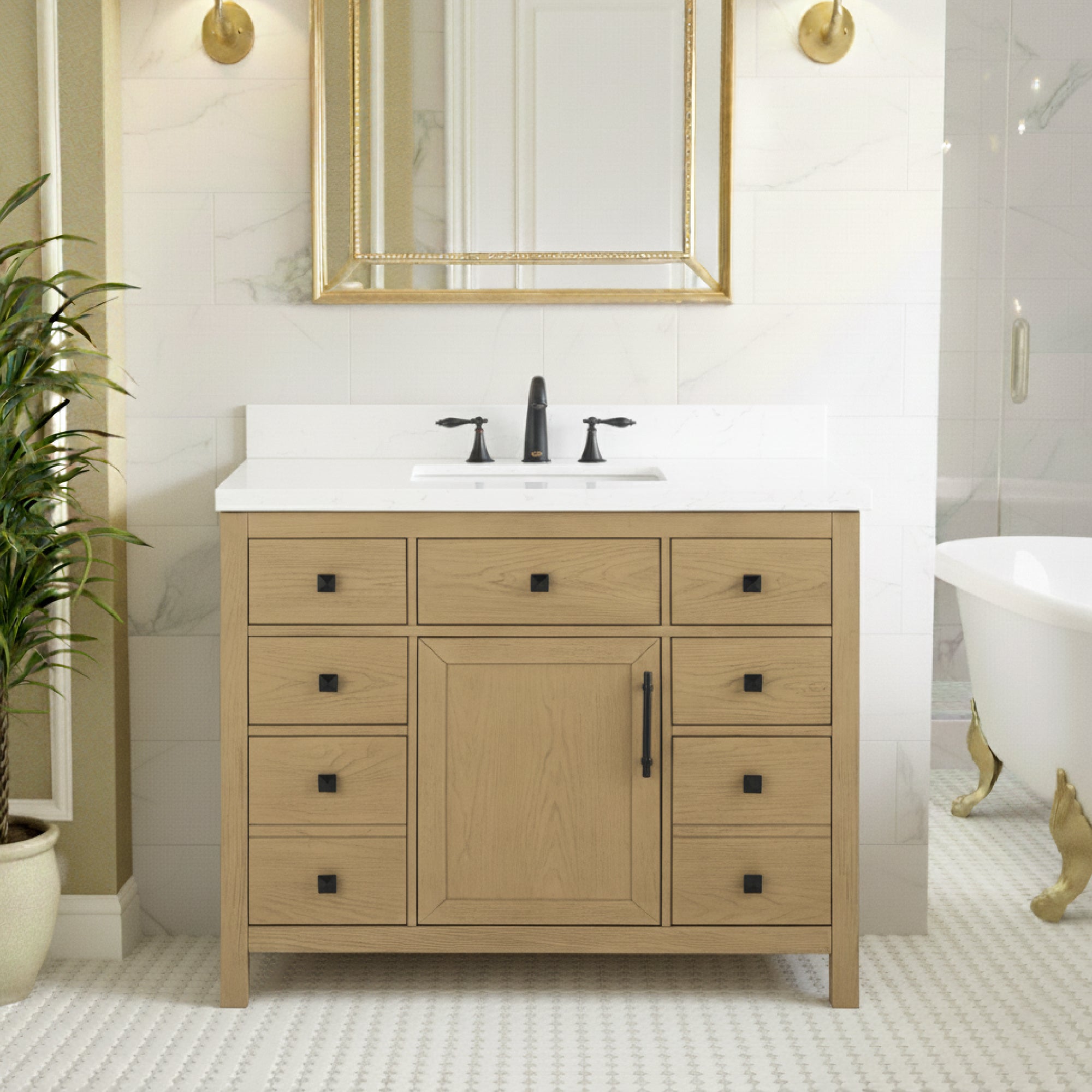 waterproof finish, soft-close doors and drawers, free back splash