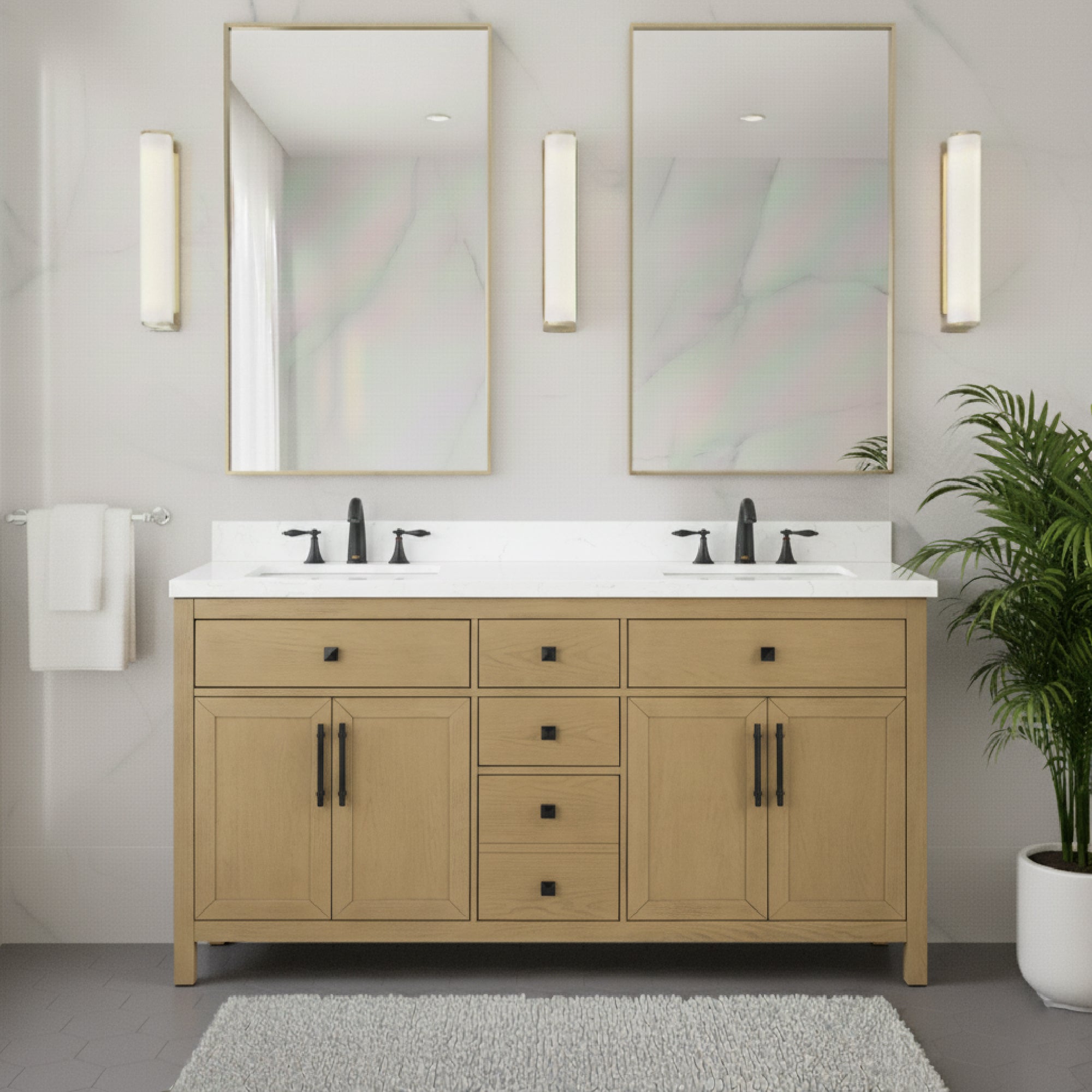 waterproof finish, soft-close doors and drawers, free back splash
