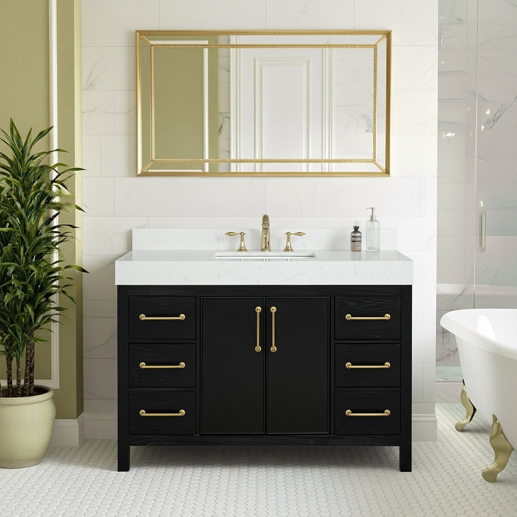 waterproof finish, soft-close doors and drawers, free back splash