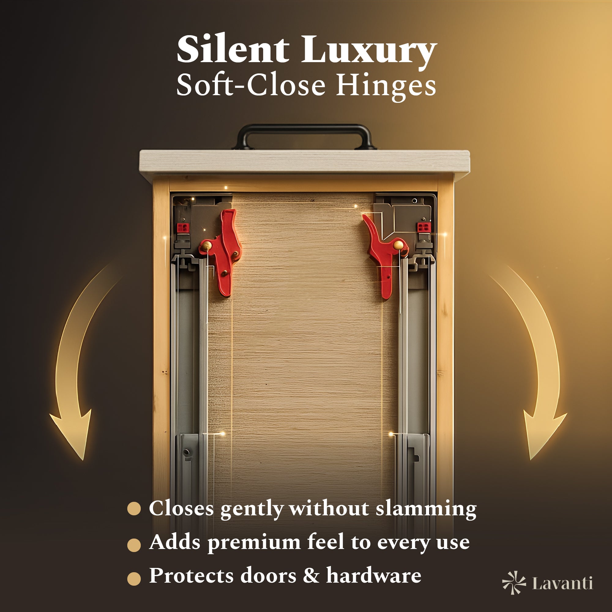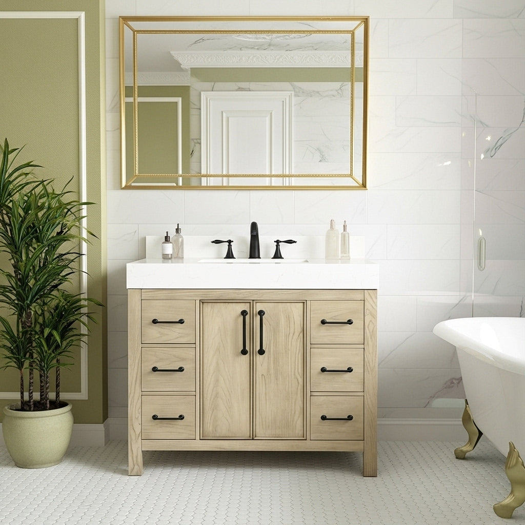 waterproof finish, soft-close doors and drawers, free back splash