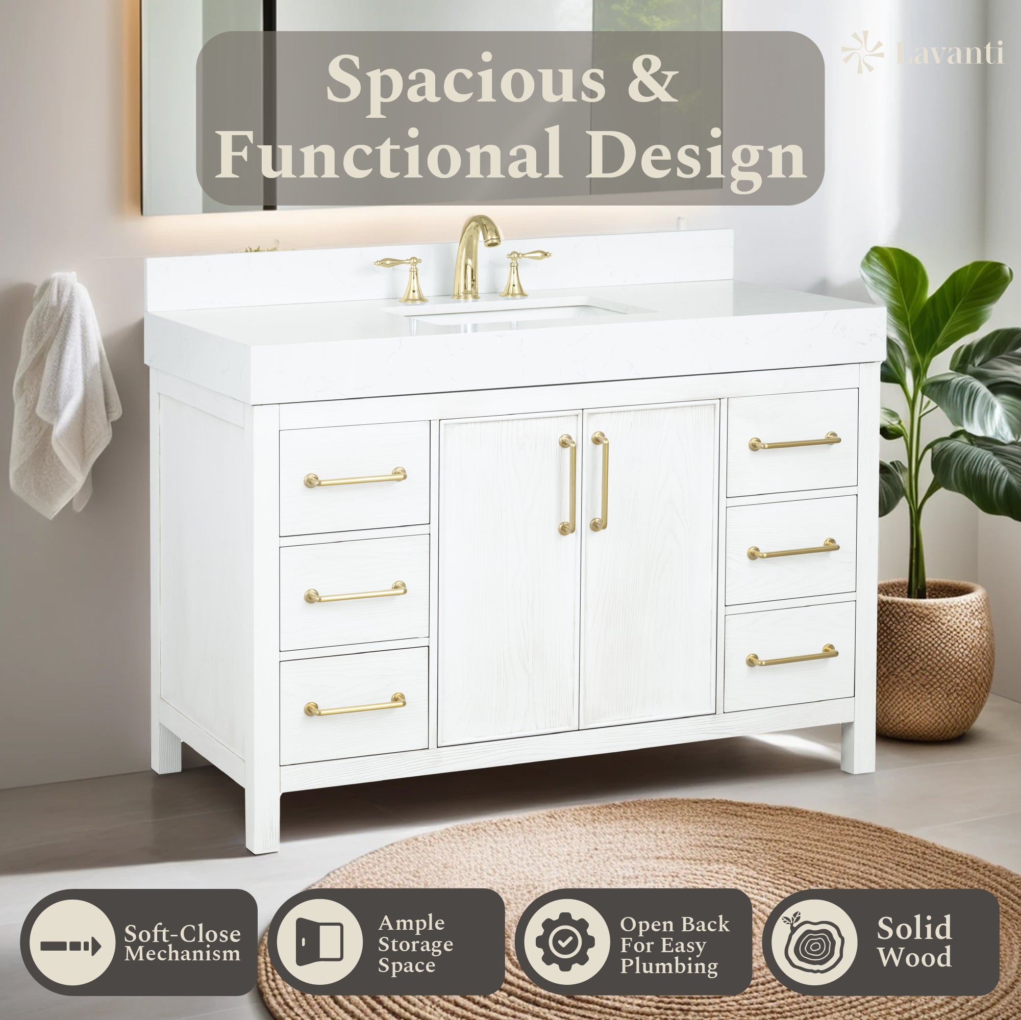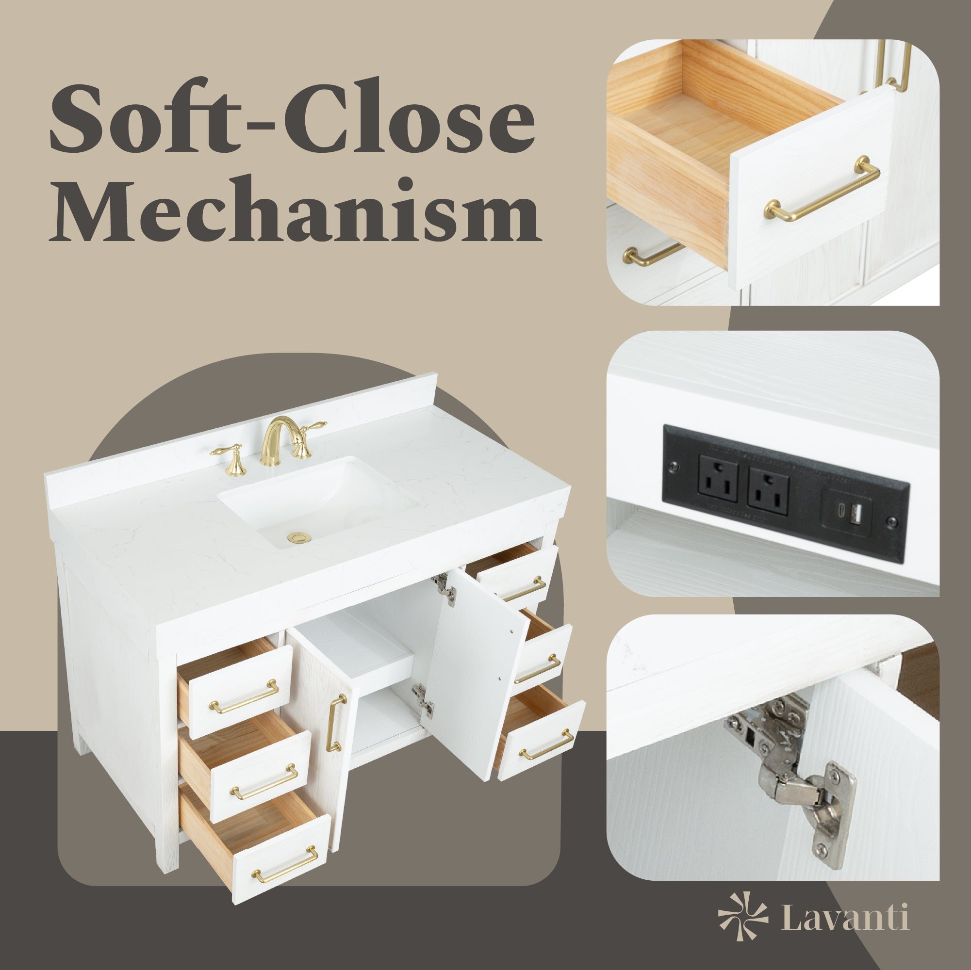 waterproof finish, soft-close doors and drawers, free back splash