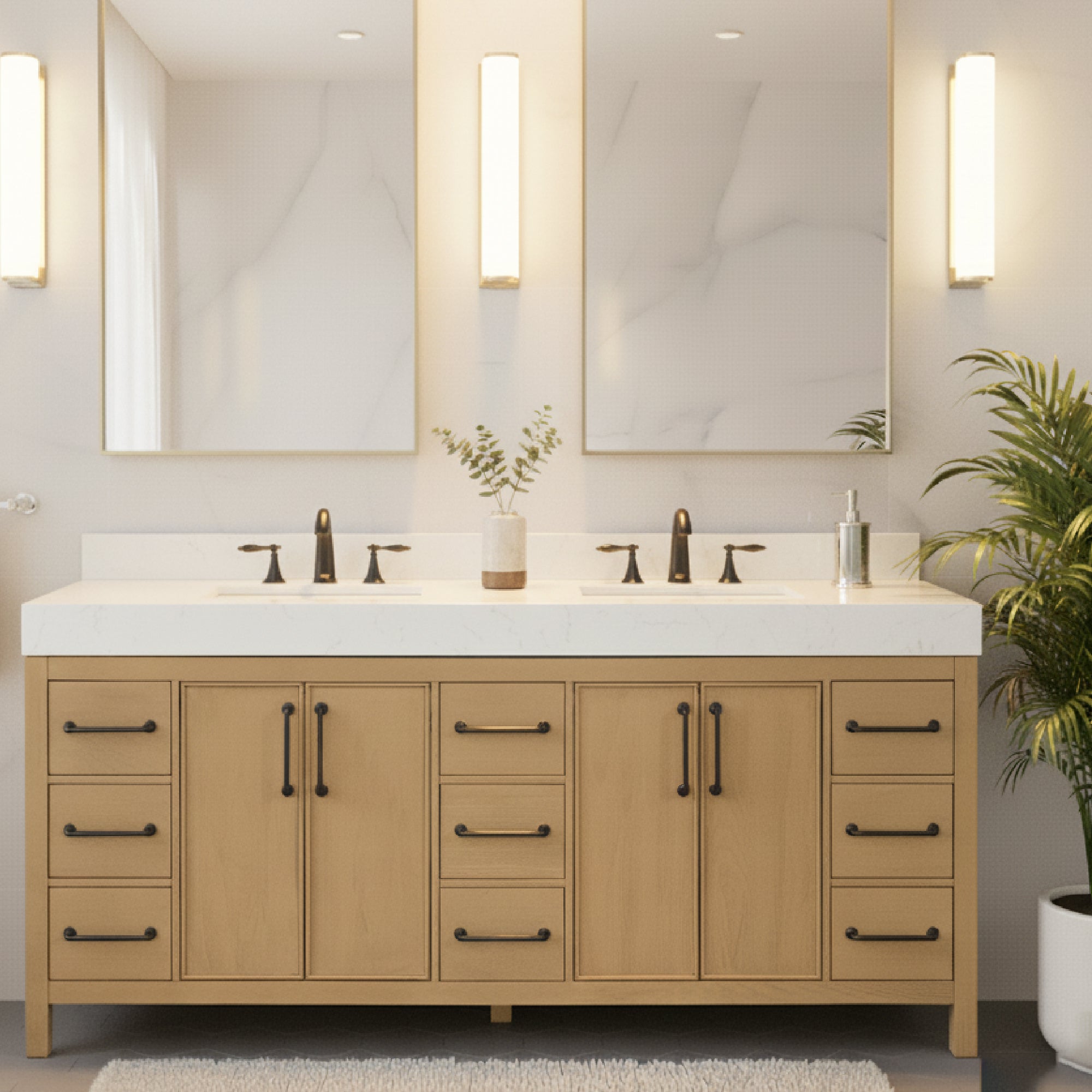 waterproof finish, soft-close doors and drawers, free back splash