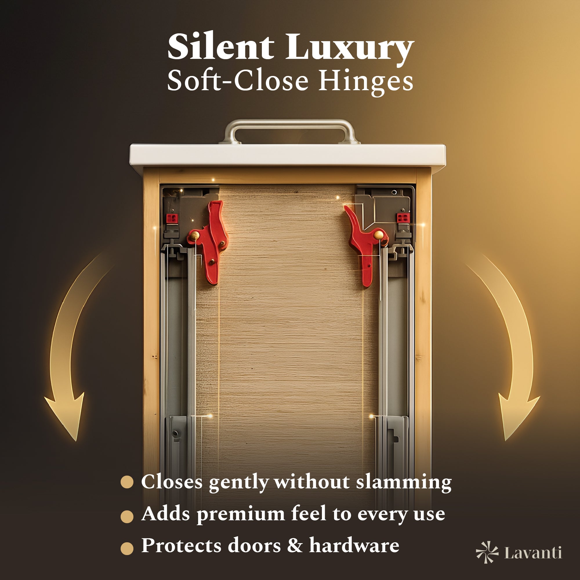 waterproof finish, soft-close doors and drawers, free back splash