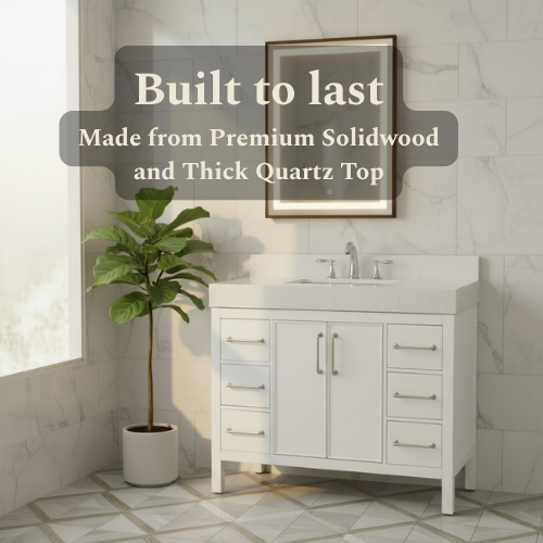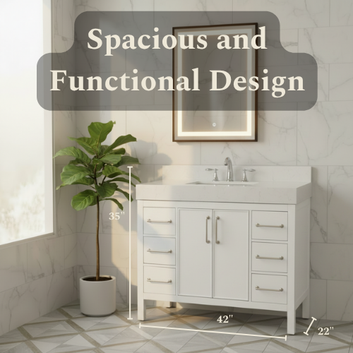 waterproof finish, soft-close doors and drawers, free back splash