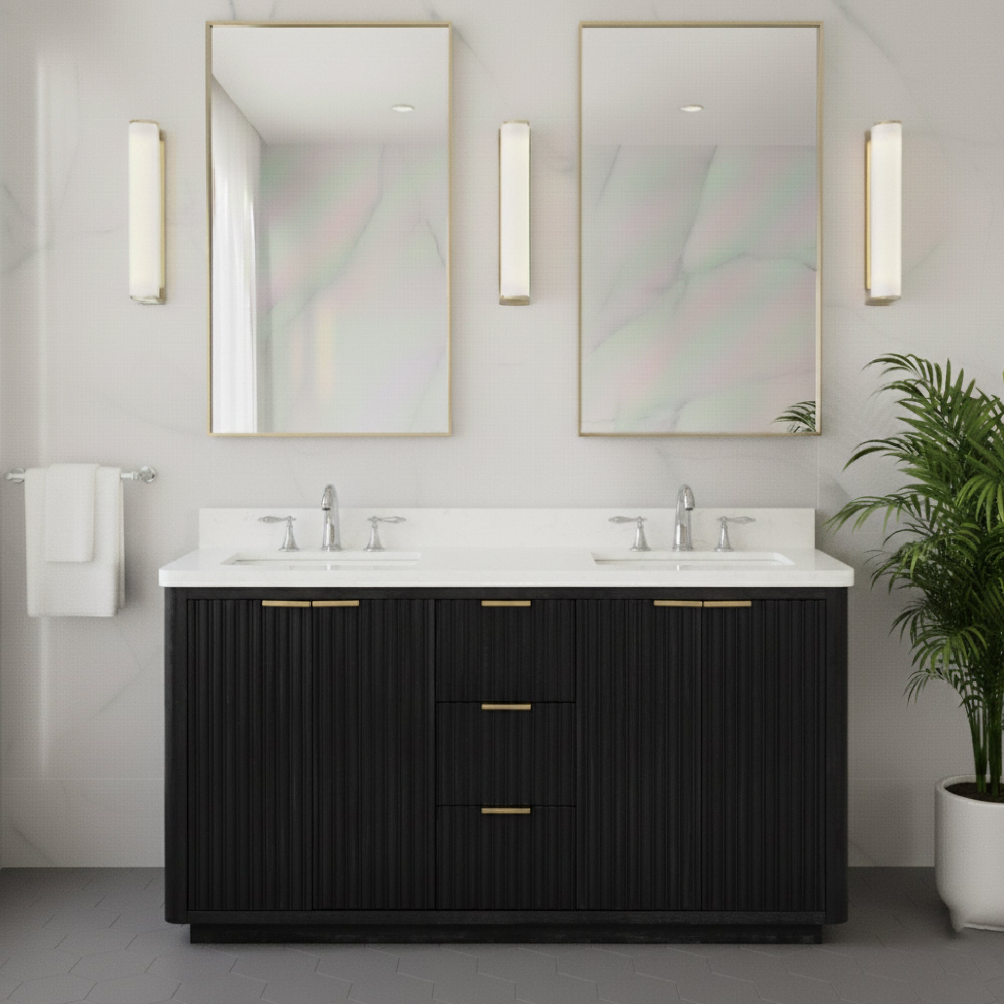 waterproof finish, soft-close doors and drawers, free back splash