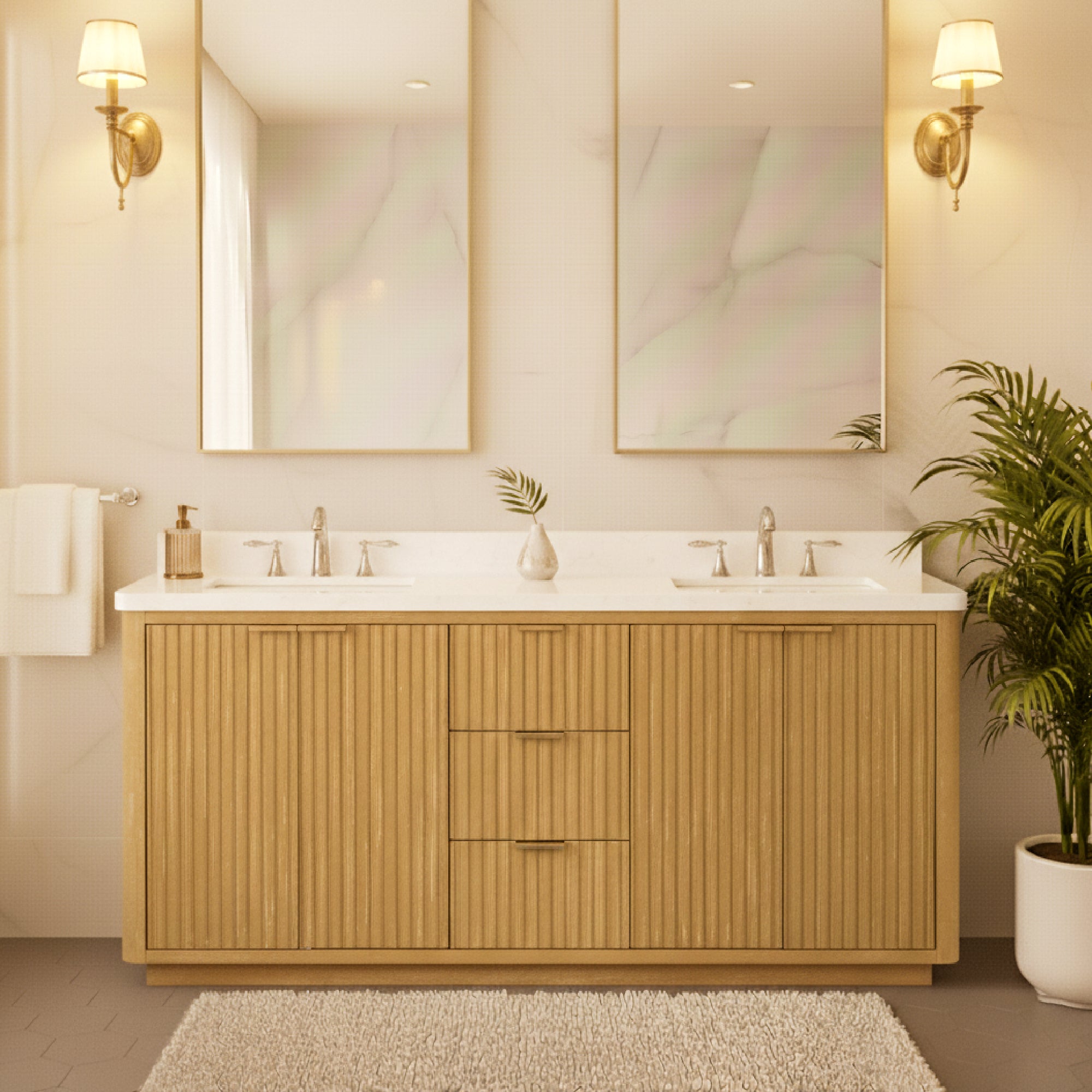 waterproof finish, soft-close doors and drawers, free back splash